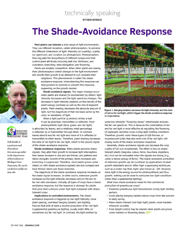 When other plants are nearby, they detect changes in the light environment and modify their growth in an attempt to out-compete their neighbors. Understanding this shade-avoidance response can help growers to promote or prevent this response, depending on the growth desired.