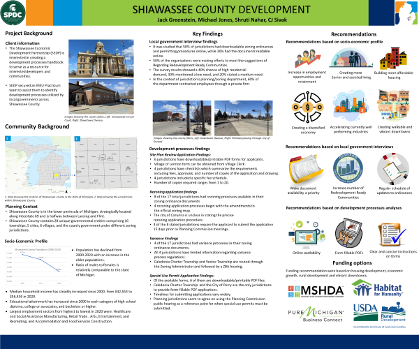 The Shiawassee Economic Development Partnership (SEDP) is interested in helping communities in Shiawassee County attract new development. They worked with the Shiawassee County Practicum team to create a development processes handbook that serves as a resource for interested developers and communities. This project utilized interviews with local government officials and comparative analysis of development processes to identify areas for streamlining, as well as noteworthy practices that can be leveraged by other communities.