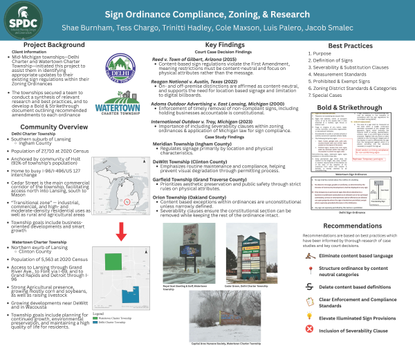 Sign Ordinance Compliance, Zoning, and Research is a student-led project responsible for examining and enhancing the sign regulations within the Zoning Ordinances of Delhi Charter Township and Watertown Charter Township. This project was led by a team of Michigan State University’s Urban and Regional Planning Program students as part of the Spring 2025 Planning Practicum course. Planning Practicum is a service-learning capstone course that engages students in real-world urban and regional planning projects in collaboration with community partners to provide students with practical experience through applied research, outreach, and hands-on problem solving. The course allows students to apply classroom knowledge to planning challenges while developing professional skills.