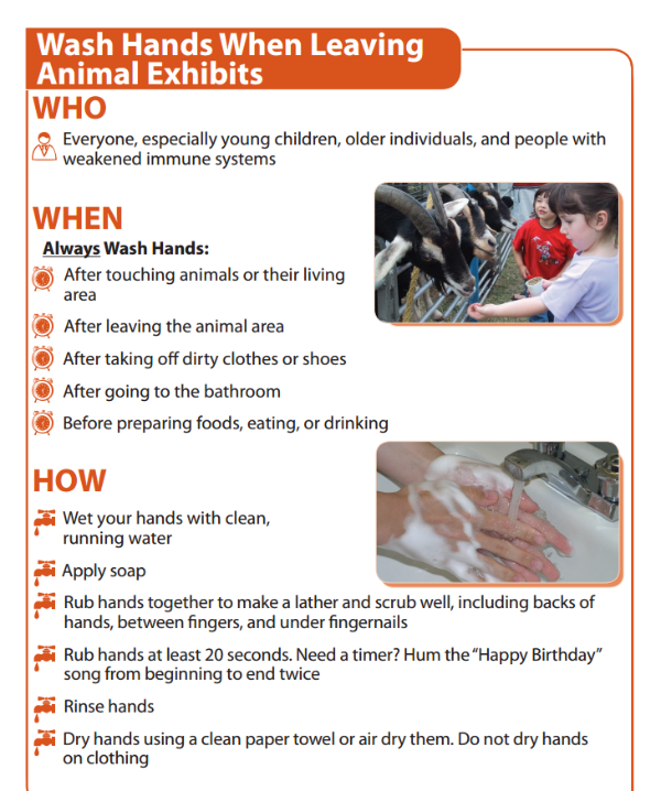 Remember to use good biosecurity practices when caring for animals. This sign covers the who, how and when for washing hands when leaving animal exhibits.