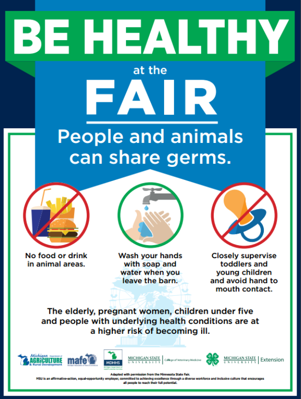 Sign created in collaboration with the Michigan Department of Agriculture and Rural Development, Michigan Association of Fairs and Expositions, Michigan Department of Health and Human Services and the MSU College of Veterinary Medicine.