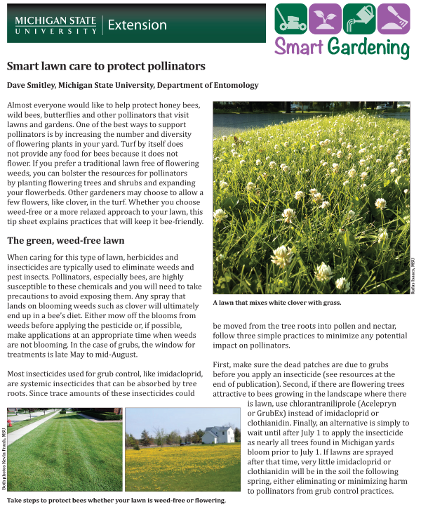 First, make sure the dead patches are due to grubs before you apply an insecticide (see resources at the end of publication). Second, if there are flowering trees attractive to bees growing in the landscape where there is lawn, use chlorantraniliprole (Acelepryn or GrubEx) instead of imidacloprid or clothianidin. Finally, an alternative is simply to wait until after July 1 to apply the insecticide as nearly all trees found in Michigan yards bloom prior to July 1. If lawns are sprayed after that time, very little imidacloprid or clothianidin will be in the soil the following spring, either eliminating or minimizing harm to pollinators from grub control practices.