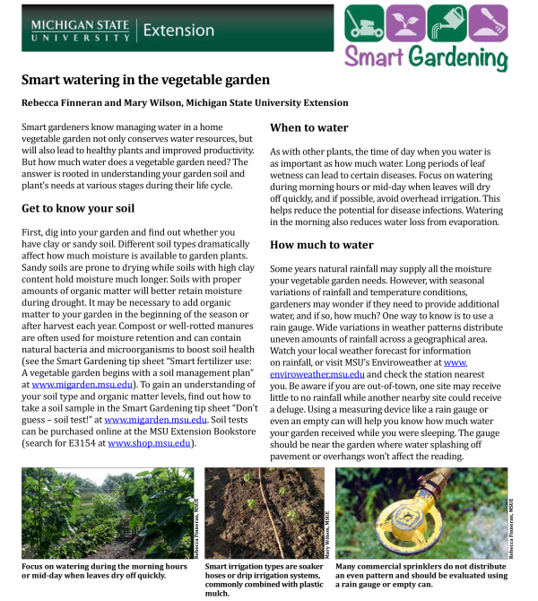 First, dig into your garden and find out whether you have clay or sandy soil. Different soil types dramatically affect how much moisture is available to garden plants. Sandy soils are prone to drying while soils with high clay content hold moisture much longer. Soils with proper amounts of organic matter will better retain moisture during drought. It may be necessary to add organic matter to your garden in the beginning of the season or after harvest each year. Compost or well-rotted manures are often used for moisture retention and can contain natural bacteria and microorganisms to boost soil health (see the Smart Gardening tip sheet “Smart fertilizer use: A vegetable garden begins with a soil management plan”). To gain an understanding of your soil type and organic matter levels, find out how to take a soil sample in the Smart Gardening tip sheet “Don’t guess – soil test!” Soil tests can be purchased online at the MSU Extension Bookstore (search for E3154).