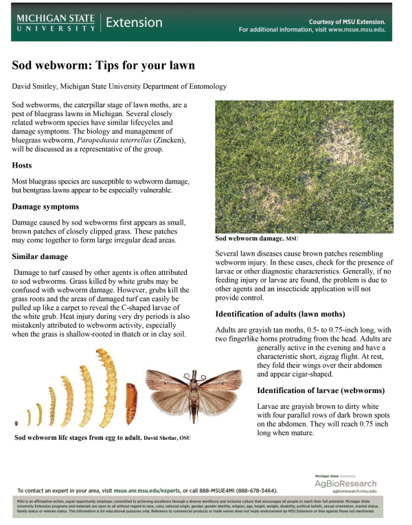 Sod webworms, the caterpillar stage of lawn moths, are a pest of bluegrass lawns in Michigan. Several closely related webworm species have similar lifecycles and damage symptoms. The biology and management of bluegrass webworm, Parapediasia teterrellas (Zincken), will be discussed as a representative of the group.