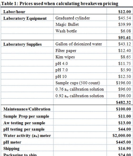 Breakeven prices were calculated using set costs for each scenario (Table 1). The breakeven point was calculated by taking the sum of costs to be incurred doing in-house testing and dividing that by the total cost incurred sending samples to an accredited third party laboratory. It would take approximately 28 samples to breakeven (Table 5).