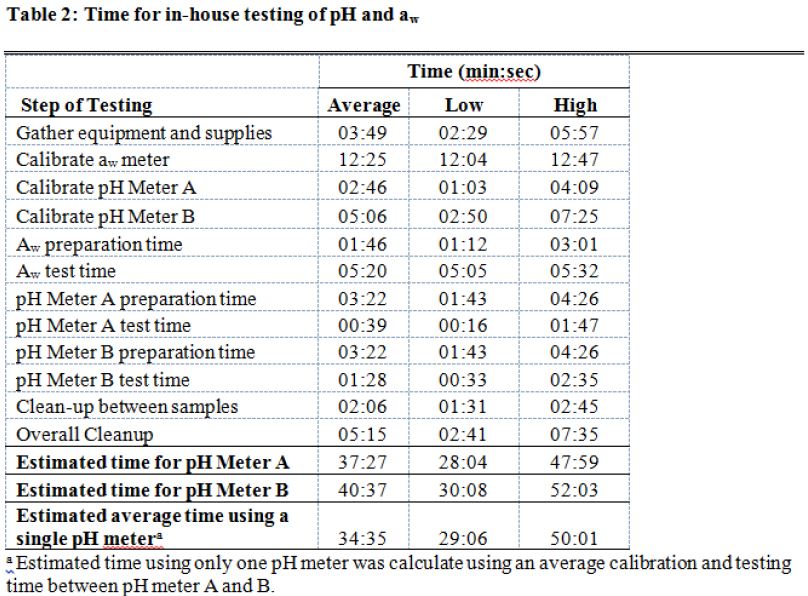 It took approximately 34 minutes 35 seconds to measure pH and aw for one sample and 14 minutes 10 seconds for subsequent samples (Table 2). It is important to note that sample preparation and operation efficiency improved over time.