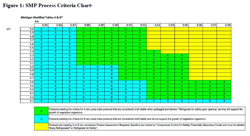The pH and aw criteria that must be met for shelf stability is displayed on the Specialized Retail Meat Processor (SRMP) process criteria chart (Figure 1; MDARD, 2014a). This chart displays the relationship of pH and aw and the points that may support the growth of potentially harmful organisms.