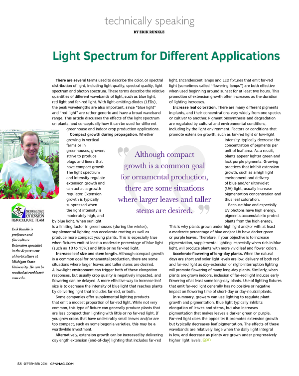 This article discusses the effects of the light spectrum on plants, and conceptually how it can be used for different greenhouse and indoor crop production applications.