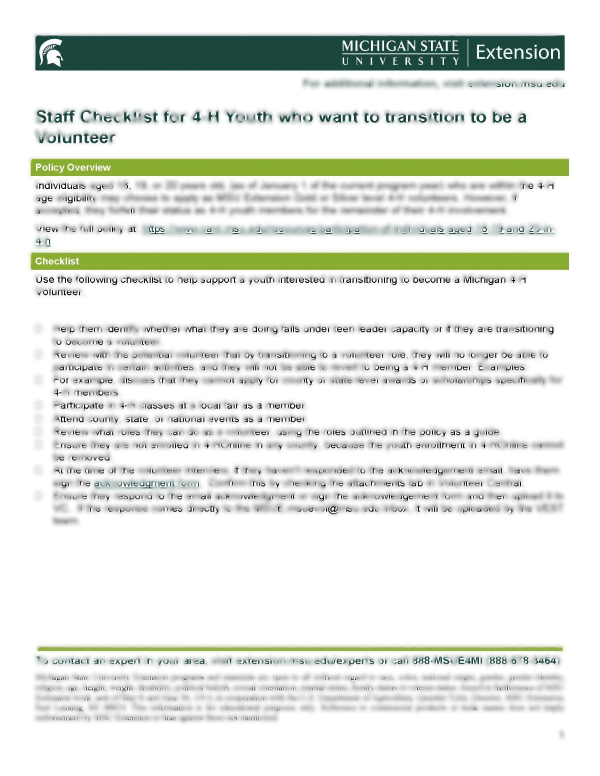 Staff Checklist for 4-H Youth who want to transition to be a Volunteer