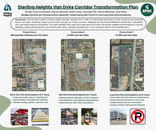 The Van Dyke Corridor (14 Mile to 18 Mile Roads) in Sterling Heights, Michigan, is a vital commercial and residential artery in one of Metro Detroit's largest suburban communities. As the city continues to grow and evolve, the corridor faces mounting challenges stemming from decades of auto-centric planning. Expansive surface parking lots, disjointed pedestrian networks, limited bicycle and public transit infrastructure, and outdated zoning regulations have all contributed to an environment that discourages non-motorized transportation, limits development potential, and reduces quality of life for residents and visitors alike. Recognizing the strategic importance of the Van Dyke Corridor, the City of Sterling Heights has identified it as a priority for redevelopment. This transformation plan provides a data-driven, community-informed roadmap for converting the corridor into a vibrant, accessible, and economically resilient mixed-use destination.