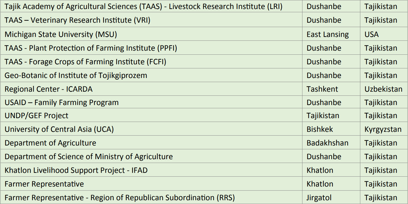 MSU partnered with Liv stock Research Institute (LRI), under TAAS in this project, and the regional partners included the International Center or Agricultural Research in Dry Area (ICARDA) and the University of Central Asia (UCA). A project stakeholder workshop was conducted on March 1, 2011 in Dushanbe, Tajikistan. There were more than 30 participants (Table 1)representing various partner institutions, development agencies, International NGOs, and representatives from four regions of the country. Presentations were focused on the objectives of the project and the feed and forage situation in Tajikistan. The participants discussed various issues related to the low productivity of livestock sector in Tajikistan.