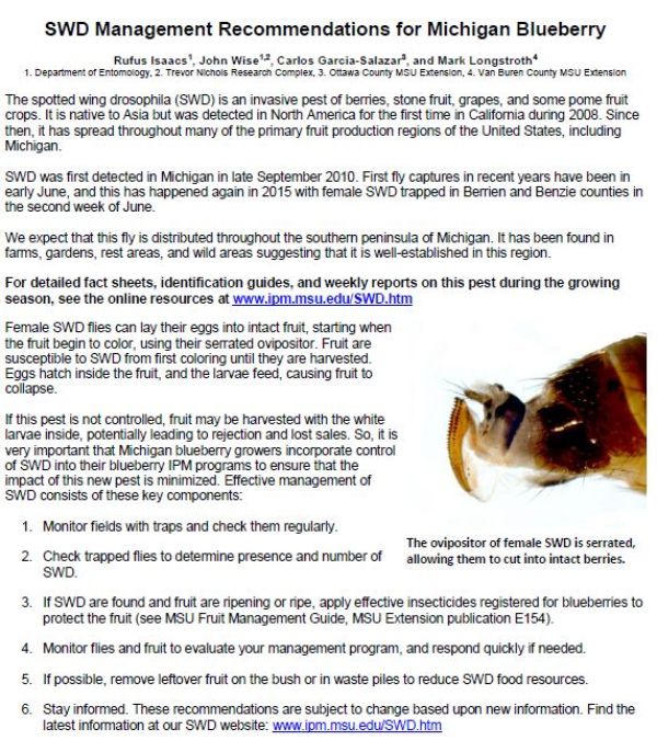 The spotted wing drosophila (SWD) is an invasive pest of berries, stone fruit, grapes, and some pome fruit crops. It is native to Asia but was detected in North America for the first time in California during 2008. Since then, it has spread throughout many of the primary fruit production regions of the United States, including Michigan.