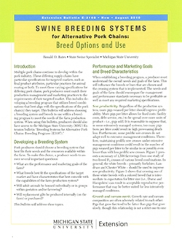 Multiple pork chains continue to develop within the pork industry. These differing supply chains have particular specifications for targeted markets, such as final product attributes, particular practices for animal rearing or both. To meet these varying specifications for differing pork chains, pork producers must match their production management and marketing practices to the requirements of their targeted market. This includes developing a breeding program that utilizes breed combinations that best align with the specifications of the pork chain(s) they target. This bulletin will address choosing a breeding system and breeds to use within a breeding program to meet the needs of the farm production system. When using this bulletin, producers should also have access to the Michigan State University (MSU) Extension bulletin “Breeding Systems for Alternative Pork Chains: Breeding Programs (E3107).”