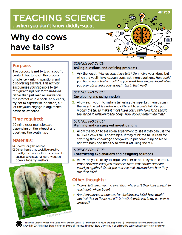 1. Ask the youth: Why do cows have tails? Don’t give your ideas, but when the youth have explanations, ask more questions. How could you figure out if that is true? Are you sure? How do you know? Have you ever observed a cow using its tail in that way?