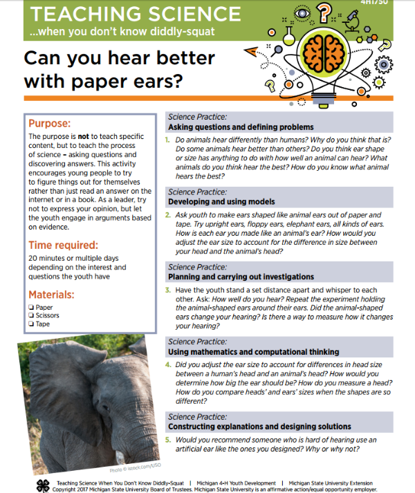 2. Ask youth to make ears shaped like animal ears out of paper and tape. Try upright ears, floppy ears, elephant ears, all kinds of ears. How is each ear you made like an animal’s ear? How would you adjust the ear size to account for the difference in size between your head and the animal’s head?