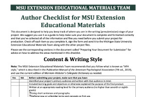 “Text Citations and References Checklist” is just a small part of the information given in the online course MSU Extension: Preparing to Submit Your Educational Project to an Editor. It will guide you as you write references and citations for your educational project.