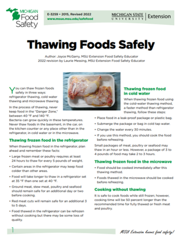 USDA Food Safety and Inspection Service. (2013, June). The Big Thaw – Safe Defrosting Methods. Washington, DC. https://www.fsis.usda.gov/food-safety/safe-food-handling-and- preparation/food-safety-basics/big-thaw-safe-defrosting-methods