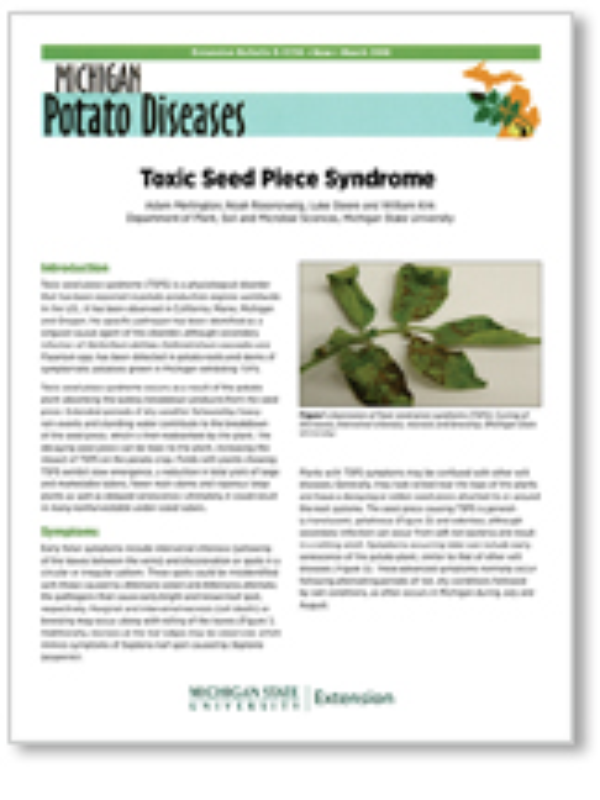 Toxic seed piece syndrome (TSPS) is a physiological disorder that has been reported in potato production regions worldwide. In the U.S., it has been observed in California, Maine, Michigan and Oregon. No specific pathogen has been identified as a singular causal agent of this disorder, although secondary infection of Verticillium dahliae, Colletotrichum coccodes and Fusarium spp. has been detected in potato roots and stems of symptomatic potatoes grown in Michigan exhibiting TSPS.