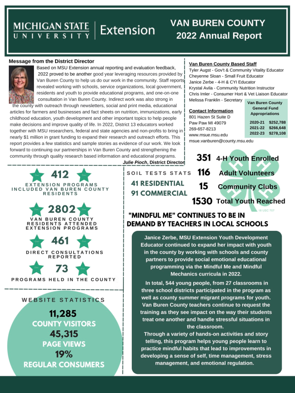 Based on MSU Extension annual reporting and evaluation feedback, 2022 proved to be another good year leveraging resources provided by Van Buren County to help us do our work in the community. Staff reports revealed working with schools, service organizations, local government, residents and youth to provide educational programs, and one-on-one consultation in Van Buren County. Indirect work was also strong in the county with outreach through newsletters, social and print media, educational articles for farmers and businesses and fact sheets on nutrition, immunizations, early childhood education, youth development and other important topics to help people make decisions and improve quality of life. In 2022, District 13 educators worked together with MSU researchers, federal and state agencies and non-profits to bring in nearly $1 million in grant funding to expand their research and outreach efforts. This report provides a few statistics and sample stories as evidence of our work. We look forward to continuing our partnerships in Van Buren County and strengthening the community through quality research-based information and educational programs.