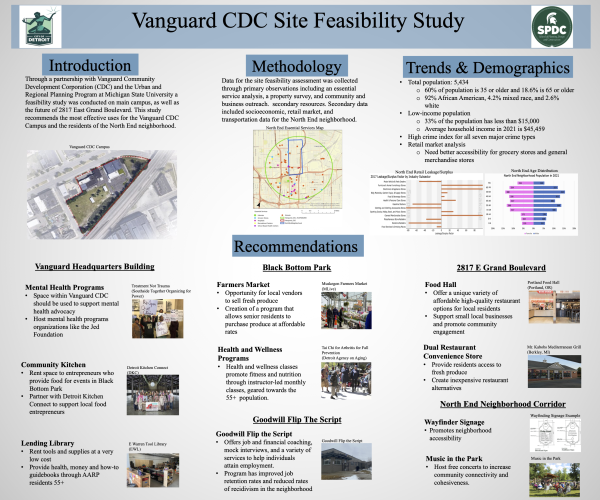 This site feasibility study was the collaborative result of eight student team members in the Michigan State University (MSU) Urban and Regional Planning Practicum capstone course. The eight team members of MSU's practicum course have provided recommendations for Vanguard Community Development Corporation (CDC) that determines the best feasible use of their campus. During the 2022 spring semester, practicum students completed site visits, land use and zoning analysis, a socio-economic profile, retail market analysis, essential services as well as other tasks to determine the best recommendations for future use. To complete the varying analysis, Census data, Detroit Open GIS, and primary collection data were used.