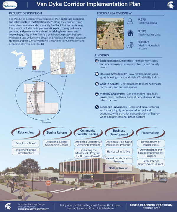 Van Dyke Corridor from 8 Mile Road to Stephens Road in Warren, Michigan. The goal of this plan is to strategically promote community-driven local economic development that helps increase livability, improve walkability, and provide equity-driven solutions for attracting development.