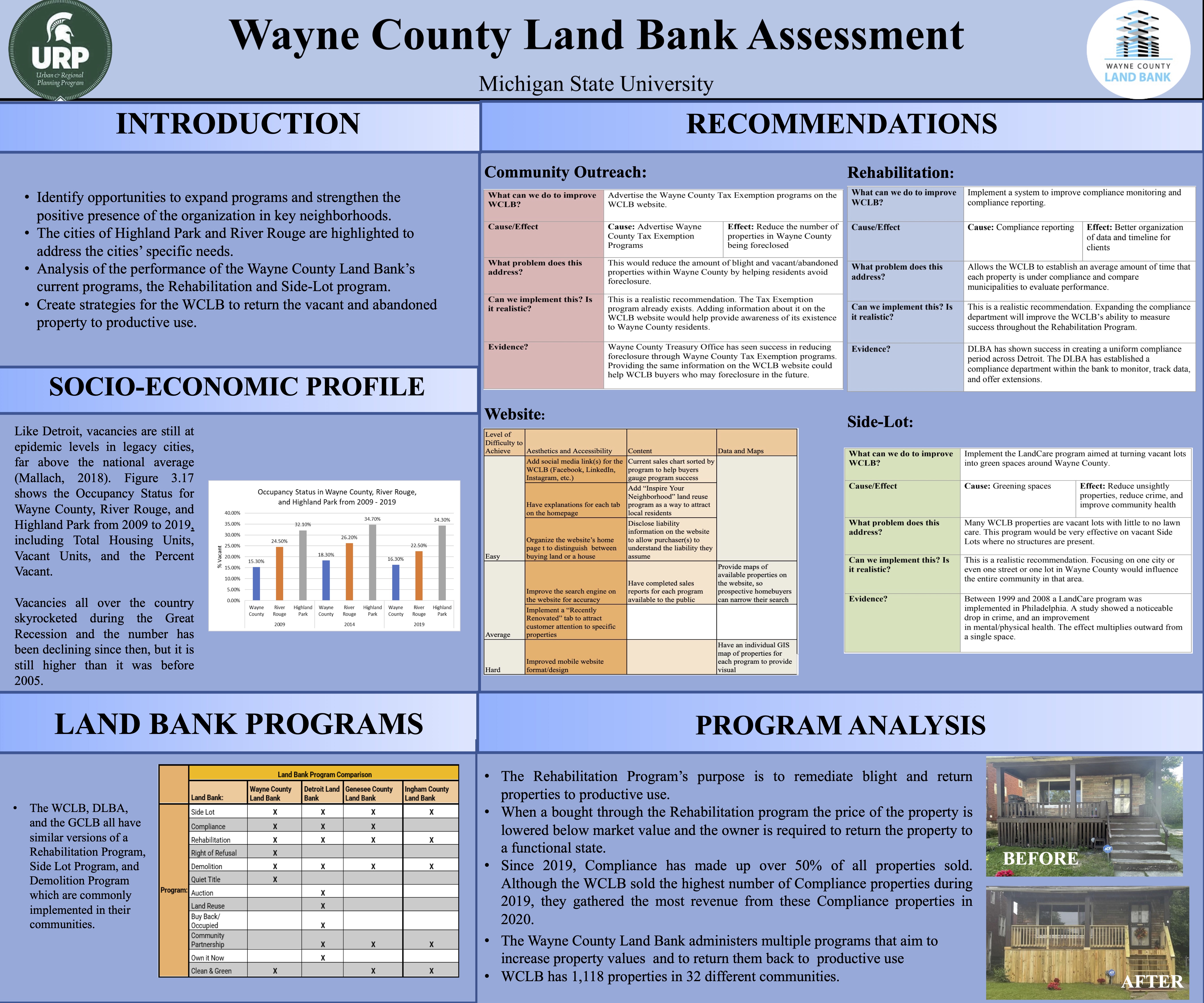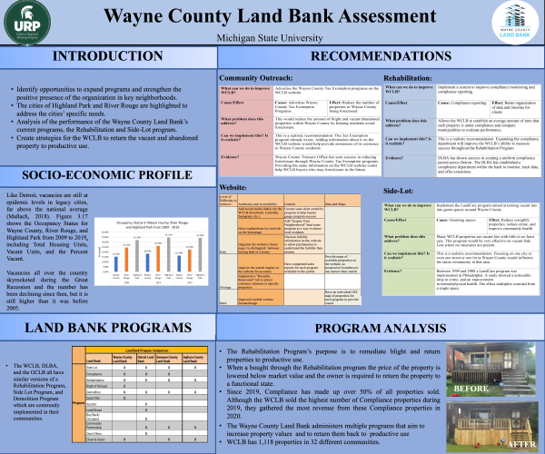 This report suggests ways to improve the Wayne County Land Bank’s programs and overall presence within Wayne County. The Practicum team focused on two communities in Wayne County: Highland Park and River Rouge. This report includes a literature review on land banks, a socio-economic profile of the two communities within Wayne County, a comparison of land banks in Michigan similar to WCLB, a community outreach survey, and an analysis of the land bank's current programs. This report aimed to analyze each aspect of the WCLB activities and assess whether the WCLB is fulfilling its primary objective of returning blighted and vacant properties to productive use. Through this process, the Practicum team identified several findings and recommendations for the WCLB.