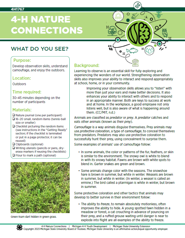 The Michigan 4-H Nature Connections lessons are intentionally designed to enhance the Michigan Academic Standards from the Michigan Department of Education (https://www.michigan.gov/mde/0,4615,7-140-28753--- ,00.html). These lessons provide an opportunity for youth to engage in and apply Michigan’s formal education standards. In doing so, young people develop the skills needed to succeed with critical thinking, collaboration, communication, and additional career-necessary competencies. Youth develop these skills in a real-world setting to experience direct concept application and personal growth. This is accomplished in a way that includes hands-on activities, experiential learning to meet students where they are, and recognition of various ways of synthesizing and applying knowledge. synthesizing and applying knowledge.