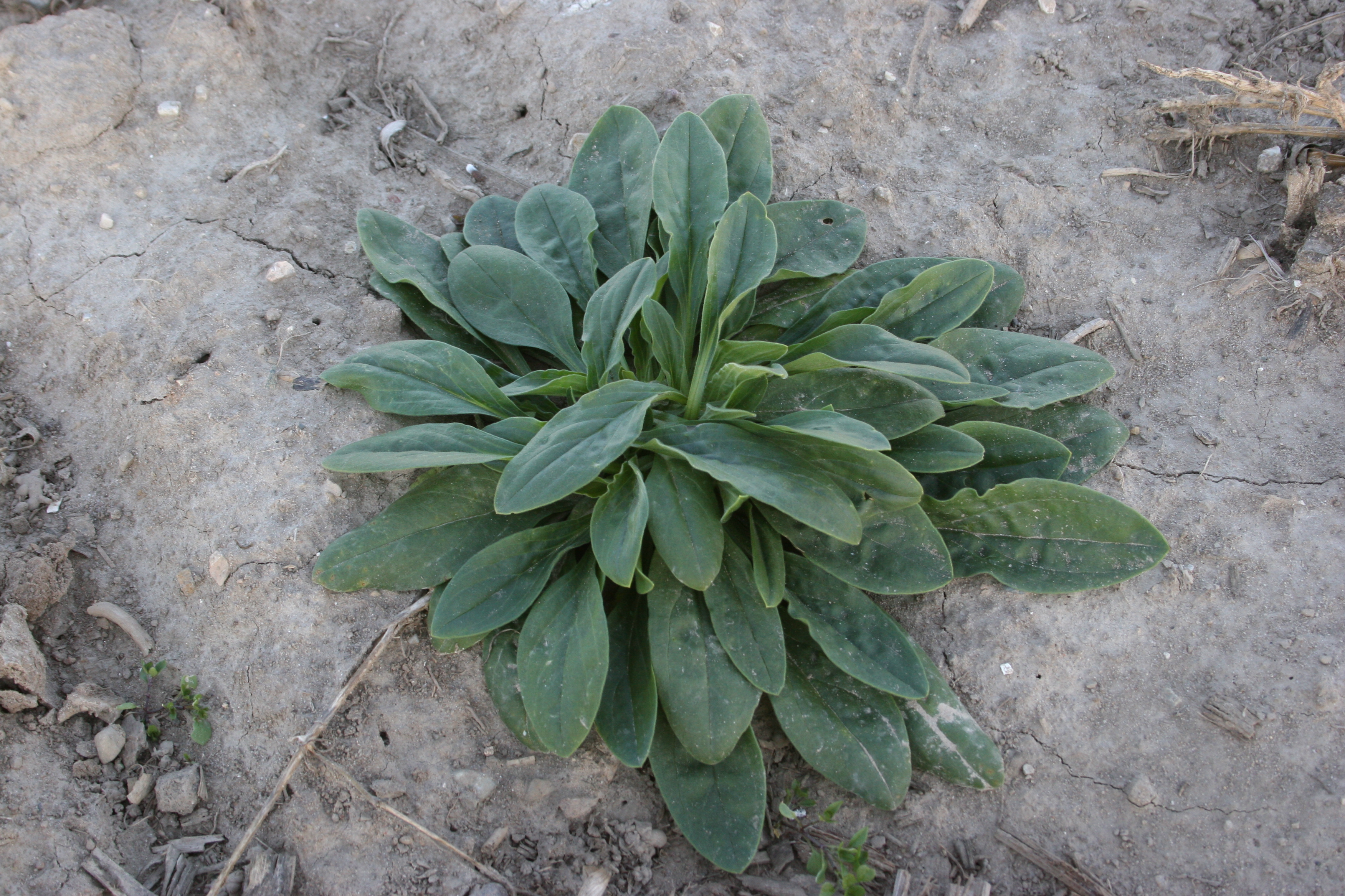 Seedling leaves initially develop from a basal rosette. Basal leaves are attached to the stem by petioles; stem leaves are without petioles. Leaves are opposite, softly hairy with a grayish tinge, and lance-shaped to oval with a pointed tip and smooth to slightly wavy leaf margins.