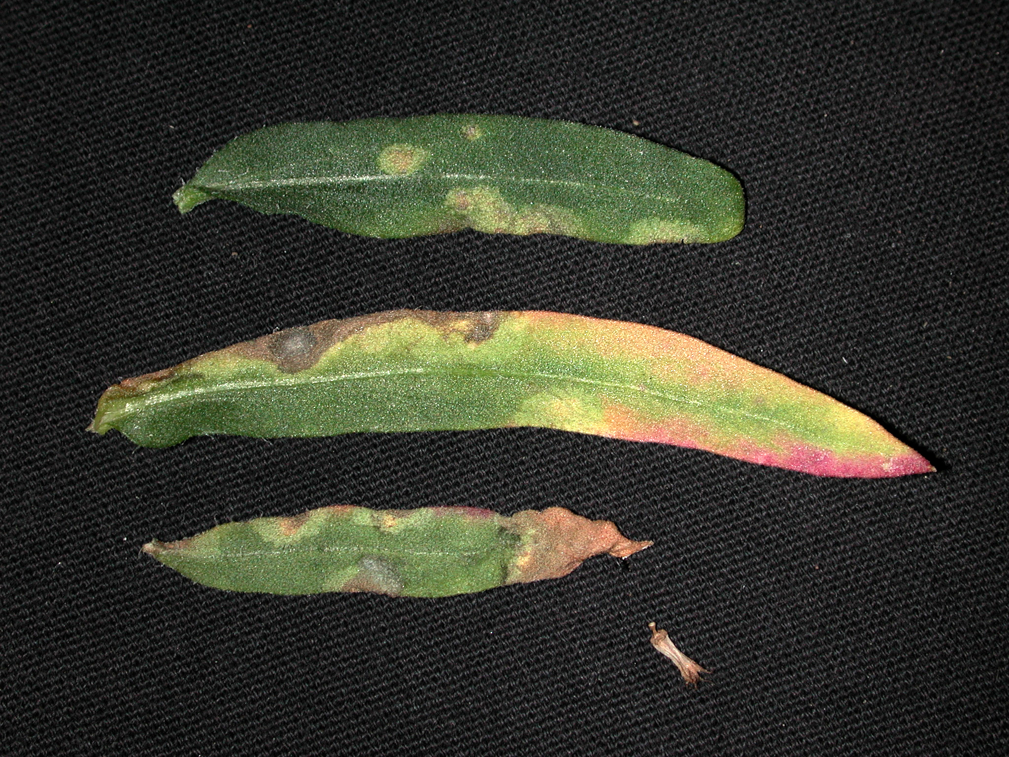 Symptoms: Round, white spots, up to 1cm in diameter, young lesions may create very faint spots. Over time the spots turn brown and become necrotic.