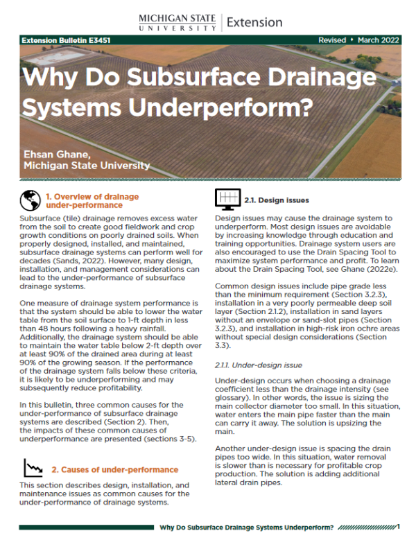 Subsurface (tile) drainage removes excess water from the soil to create good fieldwork and crop growth conditions on poorly drained soils. When properly designed, installed, and maintained, subsurface drainage systems can perform well for decades (Sands, 2022). However, many design, installation, and management considerations can lead to the under-performance of subsurface drainage systems.