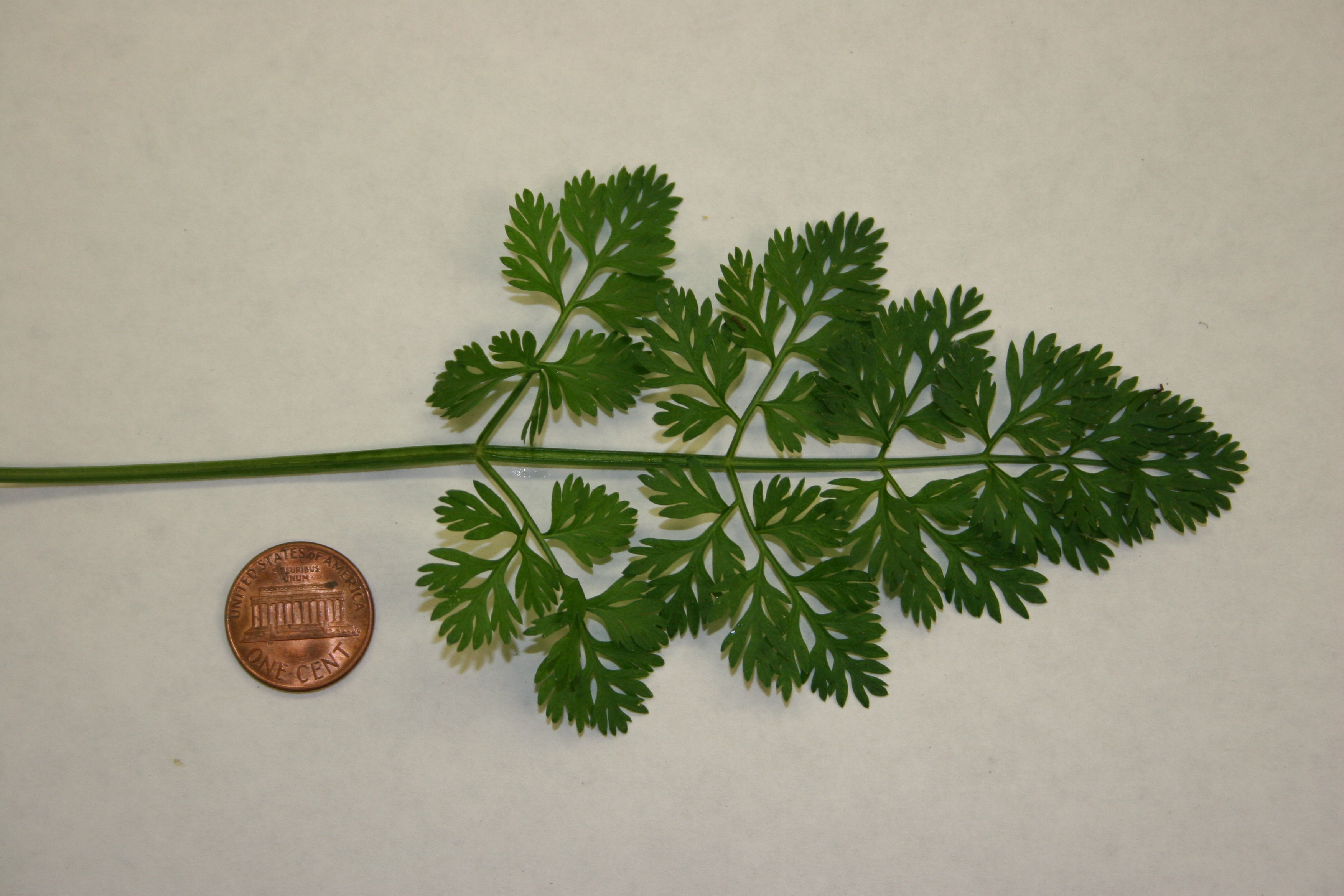 First-year leaves originate from a basal rosette followed by an erect flowering stem with few leaves in the second year. Cotyledons are long, very narrow and thin. Leaves are doubly compound, fernlike and attached by long stalks inflated at the base. Damaged leaves will emit a carrotlike odor.