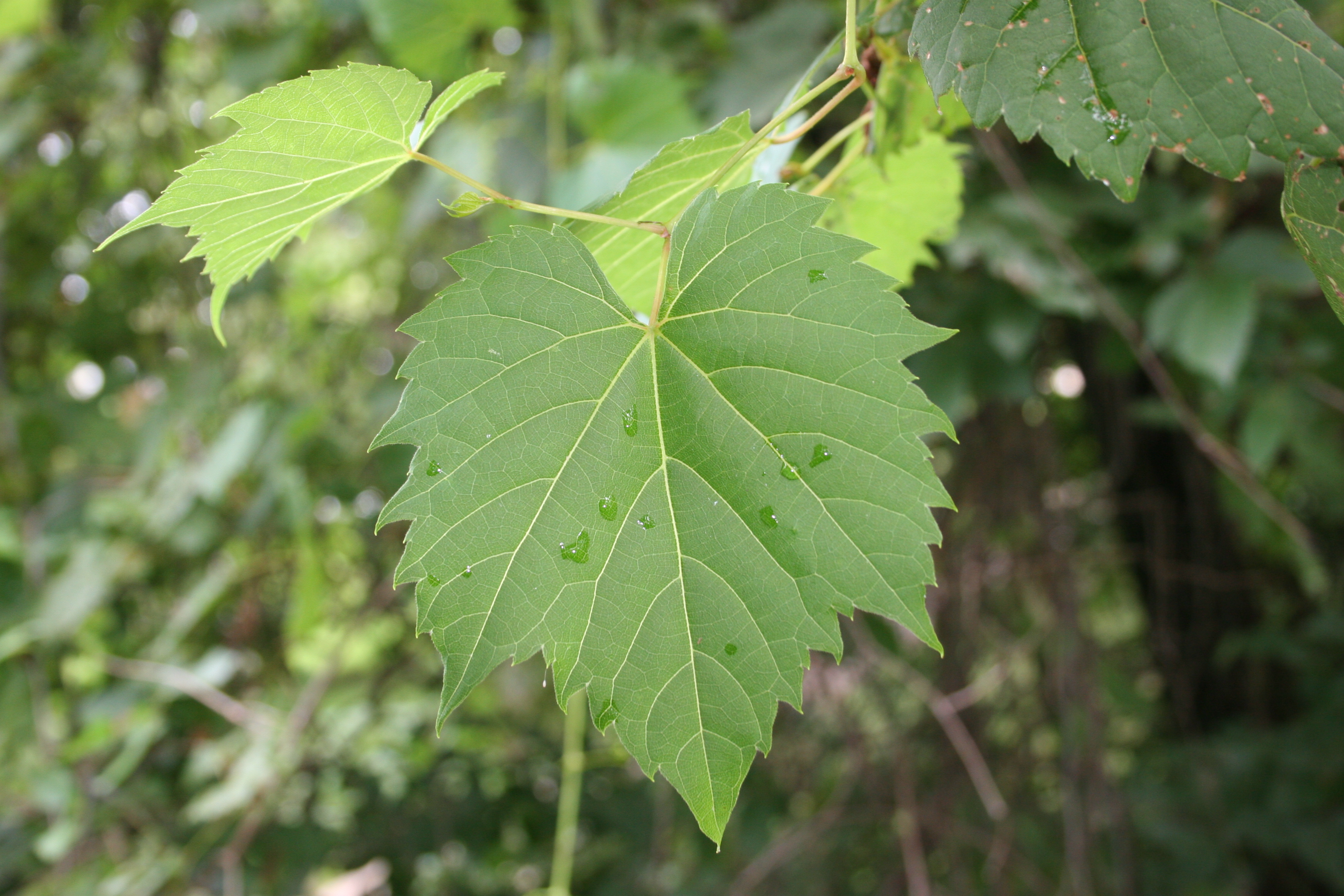 Alternate, simple, often three-lobed with toothed margins and palmate veins.