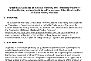 The purpose of this FSIS Compliance Policy Guideline is to clarify how Appendix A, may be used to support validation of the cooking or heat treatment steps in an establishment's HACCP plan for ready-to-eat (RTE) meat and poultry products