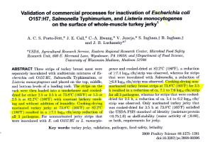 Validation of commercial processes for inactivation of Escherichia coli O157:H7, Salmonella Typhimurium, and Listeria monocytogenes on the surface of whole-muscle turkey jerky. -