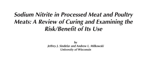 A paper examining the use of sodium nitrite in meat and poultry processing as well as a review of curing and its risks and benefits. -