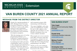 Despite the ongoing pandemic of 2021, Michigan State University Extension continued to work for Van Buren County youth, adults, businesses and communities providing outstanding researchbased education and community development programs. -