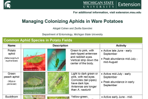 While aphids are common crop pests, only three can become an issue in ware potatoes: potato aphid, green peach aphid and buckthorn aphid. This fact sheet shows how to scout for and manage these species. -