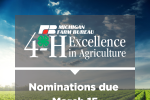 The Michigan 4-H Foundation is seeking nominations of remarkable agricultural 4-H volunteers for the Michigan Farm Bureau (MFB) 4-H Excellence in Agriculture Award. Nominations due March 15. -