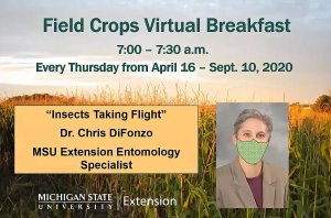 The MSU Extension Field Crops Virtual Breakfast weekly discussion for July 16, 2020, focuses on mid-season insect update, presented by Christina DiFonzo, MSU field crop entomologist. Following DiFonzo’s presentation, MSU specialists give updates and answer questions on insect pests and diseases and current conditions.