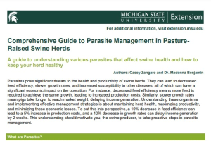 Thank you, Beth, and thanks to all of you for being online tonight. As Beth mentioned this evening, we're going to talk about I think Beth, I can advance the slides, right? Yeah, preventing and treating parasite infection and farm animals. And my interest in this topic goes back about 65 years now when I was a little kid living on a farm and we had a lot of animals and I'll never forget my fifth birthday or shortly thereafter, I realized, we realized that I was harboring to parasite infections at the same time. One was pinworm and the other was mange. I'm sure there are things that I picked up in part from playing around in the manure with our animals and the mud and then probably get the pinworm from other kids at school. But it's stimulated an interest in me that I've had for about 25 years or 65 years now, I actually worked for 25 years in the field. This evening then Beth and I thought we would focus a little bit about parasites and their hosts. Why parasites are so hard to control. And then we're going to spend some time talking about preventing parasite infections and trading site infections, which are two different things shown in the figure there as one of the large roundworms, Ascaris, which is parabola in many pigs, including pigs here in Michigan. There are literally hundreds, maybe thousands of different parasites that we could consider that infect animals. And what we're gonna do tonight is we're going to just focus on a few parasites that are important in animals that reside in Michigan. So parasites either live inside the body, in which case they're referred to as endoparasites. And some examples are the roundworms shown here including Ascaris, whipworm, thread worm, and some others. They can live in tissues outside of, outside of the gut. And these include the Trichinella, lung worms and kidney worms. And those parasites live most of their life cycle within those tissues. Then there are tapeworms, which can grow to be 20 ft long, live in the gut, different, different species, the plane on the host animal, liver flukes that live in the liver. And then there's a whole group of protozoa. And we've just shown a few of the more important ones here. Toxoplasma attack city, cryptosporidium and giardia. These are important to farm animals. The ectoparasites, on the other hand, live on the surface and they're usually insects of some type. They're arthropods have some type. There are some spiders too. But the important ones that you'll need to know about our mites lice. And then a little bit, we'll say a little bit about flies, stable and horn flies and a little bit about mosquitoes. The things that I've highlighted in yellow here are what we refer to as zoonotic parasite. They can live in people and they can also live in our animals. So they're especially important. Now in livestock. Most of the parasites that we're going to talk about tonight are not actually lethal. There are some exceptions and we'll talk about those later. But usually they don't actually kill the animal. They just make them sick and they make them less productive. But some of the signs you'll see are itching, scratching. The animals will be agitated. If they, if they're parasites, endoparasites that reside in the gut, you'll see usually some dehydration and some diarrhea. While they're living inside the body, they're parasitized and essential nutrients and that's really important. It makes the animal less healthy. It also can slow growth and reduced efficiency. And in terms of if you're a farmer and you've got parasites, That's really the crux of the problem right there. That's the thing that you're concerned most about. They can injure vital organs and cause the organs to be condemned, as in the case of this photograph we showing here of a pig liver that's been condemned by white spots caused by granuloma is formed around Ascaris eggs in this case. They also cause a lot of immune reactions and they mess up the immune system of the animals, which increases the susceptibility of the animals to disease, especially the GI and respiratory diseases, and especially those caused by viruses and bacteria. And these can be very important. Those diseases then can, are more likely to kill the animals and the parasites are, but the parasites do cost US farmers billions of dollars a year. Nevertheless. Okay, understanding a few key themes we think are really important to understanding parasites. If you understand these things, then I think you're in a better position to understand how to prevent disease by parasites. And why treatments are so complicated sometimes. First, they require an animal for nutrition and reproduction during most stages in their life cycle. That's really fundamental. That defines what a parasite is. Their eggs that they produce often in very large numbers can last for many years. Ascaris eggs and try curious eggs can live as long as ten years in the soil. And then they get ingested, taken up by another animal, maybe a great, great, great grandchild of the animal that put the eggs there. And then they can make the animal very sick. Some ectoparasites transfer other parasites to host animals in an examples of this is the classic one, is the mosquito, which is an ectoparasites and it trans fors a malarial protozoan parasite to any other animals or many of the animals that it bites. Another example I'd like to talk about is the black fly, which will harbor these little microfilaria of onchocerciasis and they'll bite people and cause river blindness. Some transfer bacteria or viruses. Classic examples that you're aware of or the tick which transmits lyme disease, which is a virus. Mosquito which transmits Eastern Equine Encephalitis, which is a virus. And then we mentioned Ascaris eggs, which can themselves actually transfer E coli, harmful pathogenic E coli, to different parts of the body and make animals very sick. Another point is host animals like our livestock, they can harbor many, many species and 